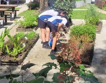 Photographs of students exploring the garden and sharing their learning