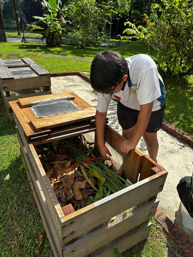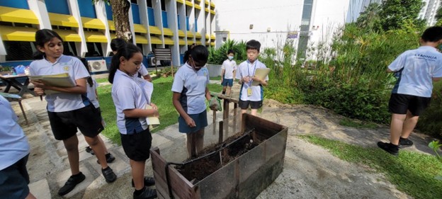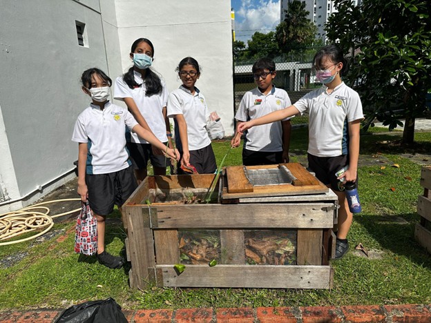 Our Primary 6 students showed how sustainability could be achieved even within the small compound of our very own school. Science Stewards from various P6 classes had their first-hand experience in amassing compost. The compost was later used to fertilise the soil for plants to thrive in the school. Food waste such as banana skins were broken down by the African Night Crawlers in the soil to produce compost.