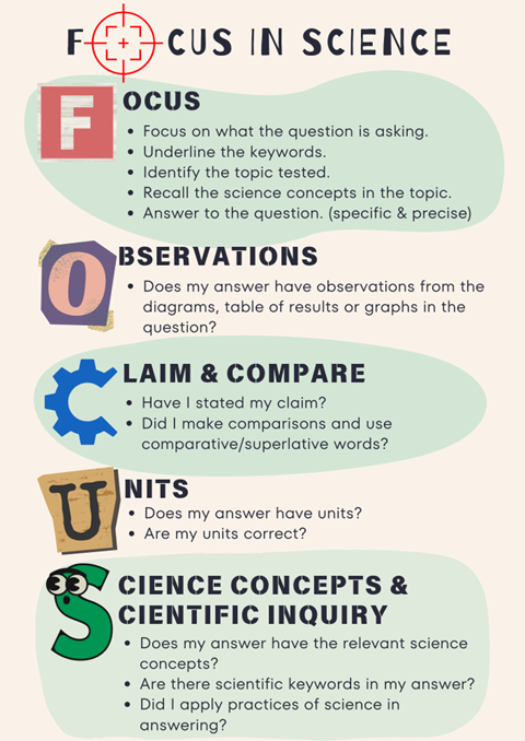 Teachers in our school adopt the FOCUS in Science framework to develop students’ scientific thinking and structured responses. This structured approach enables students to tackle Science questions with clarity and precision, boosting their confidence.